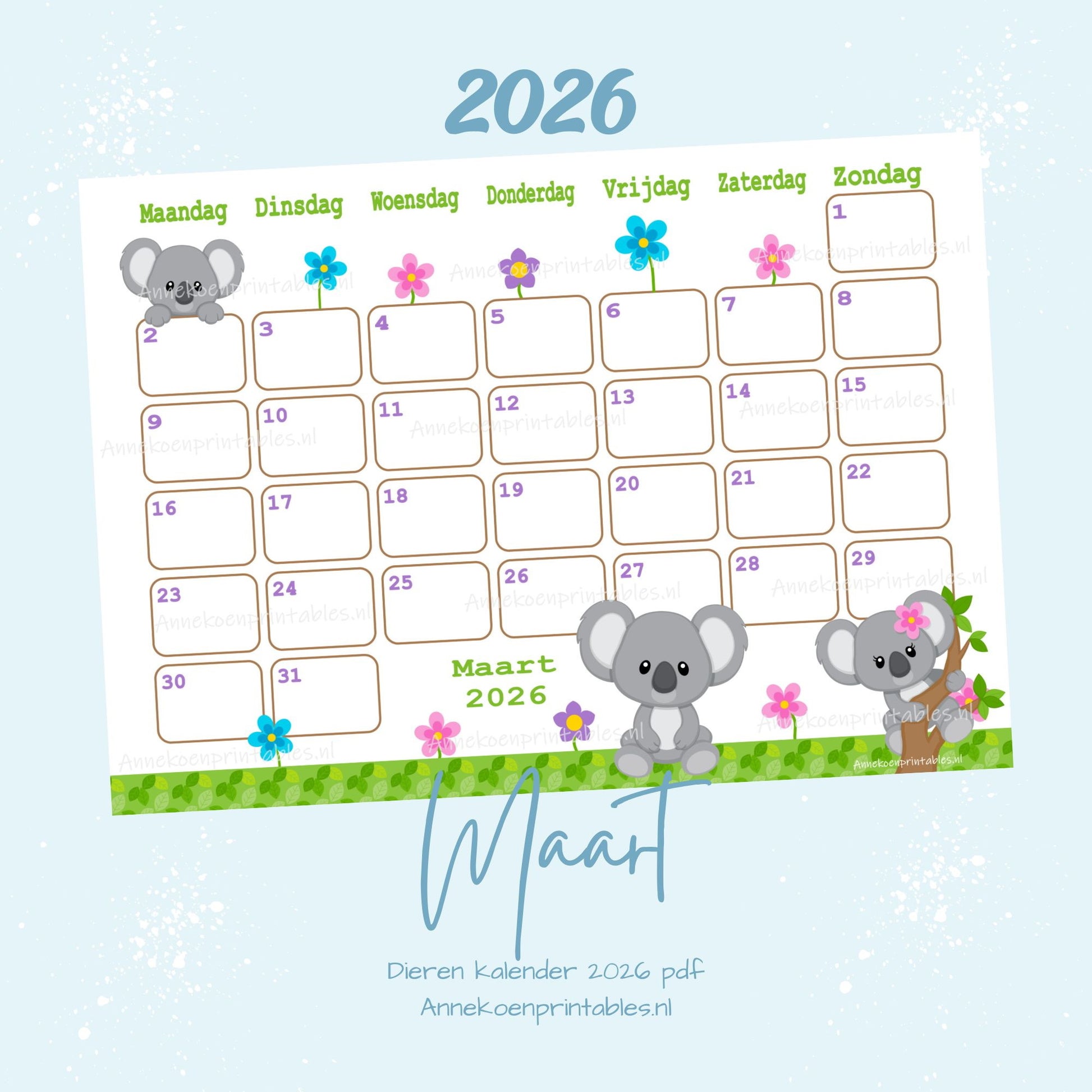 Maart 2026 maandkalender Koala (serie jaarkalender Dieren).