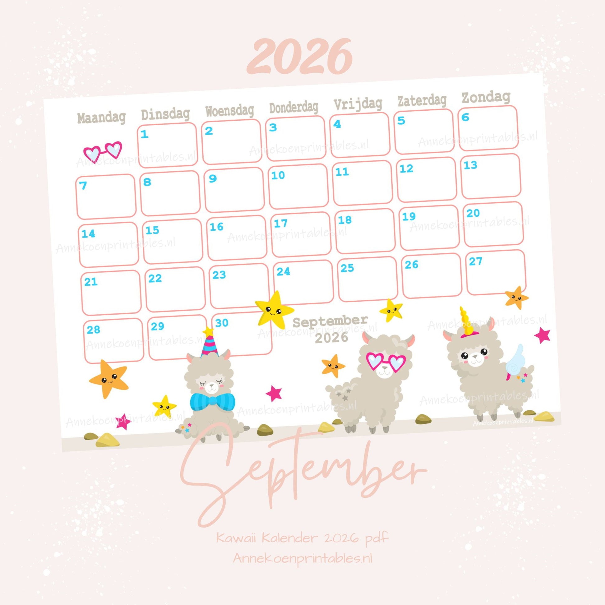 September 2026 maandkalender Lama thema (serie jaarkalender Kawaii).