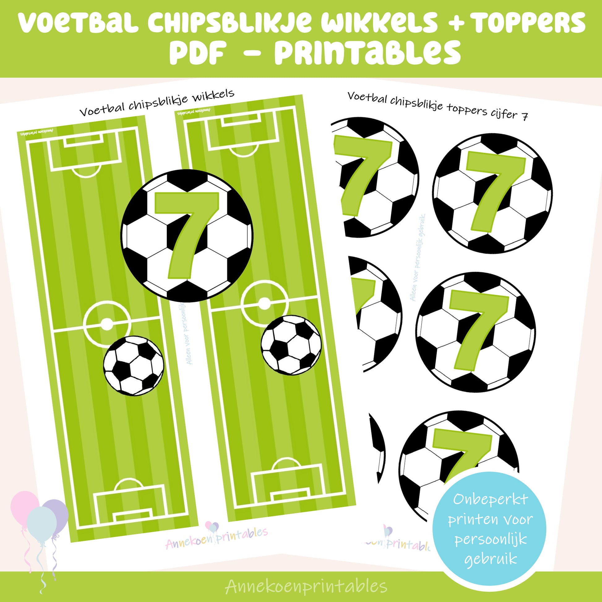 Voetbal wikkel en toppers voor kleine chipsblikjes. Met topper cijfer 7.